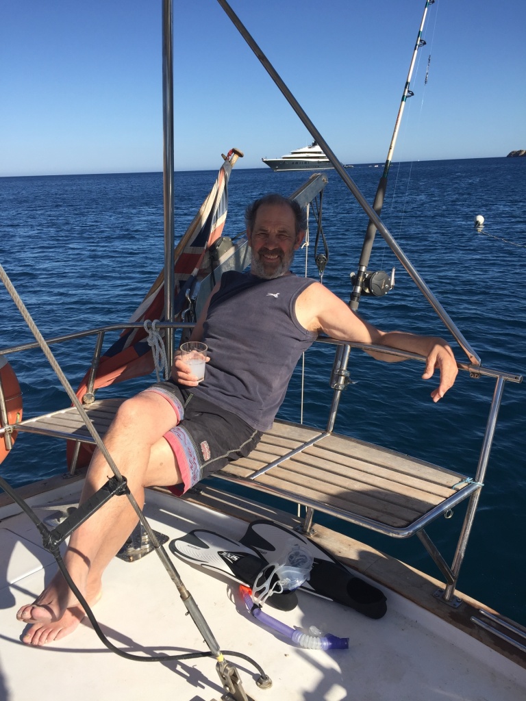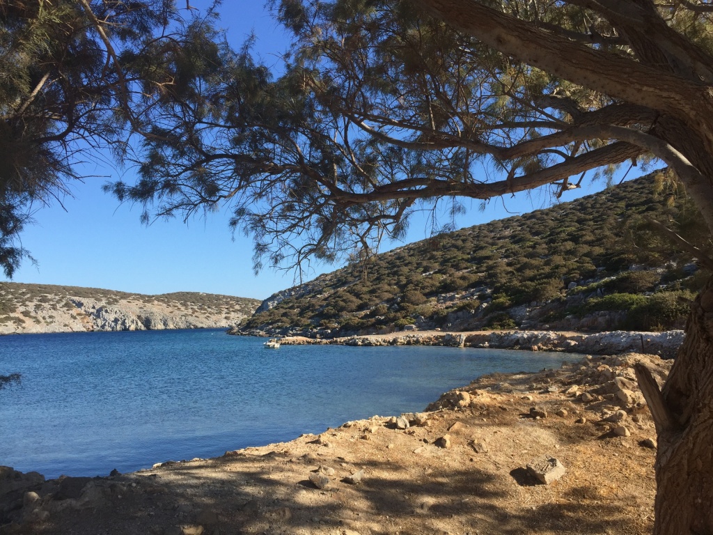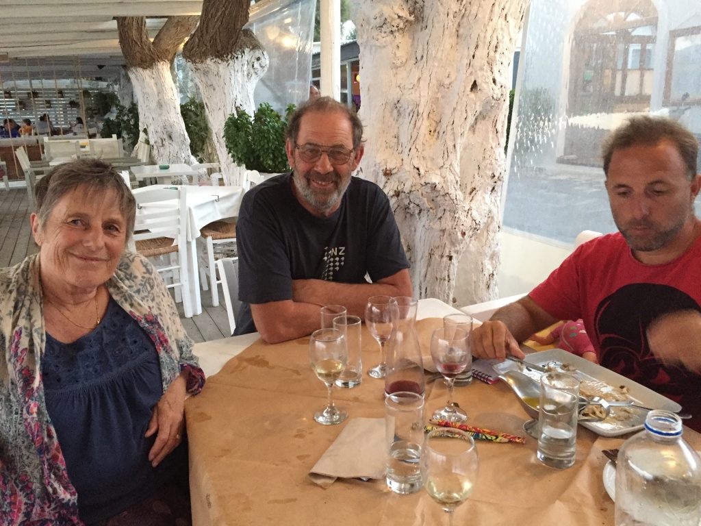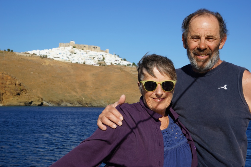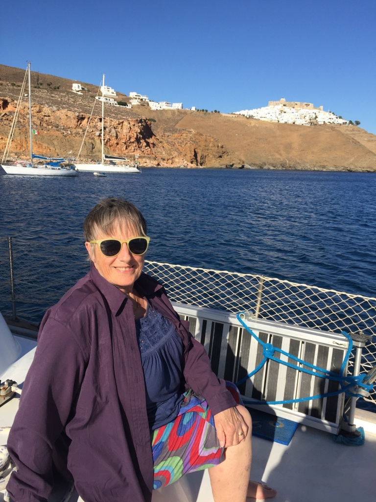 We anchored near Skala, to have a lovely birthday dinner at a restaurant on the beach. We enjoyed the view over the bay and old Chora on top of the hill – including a full moon!