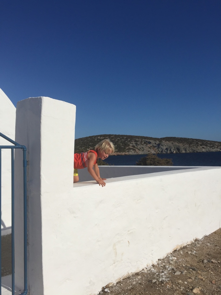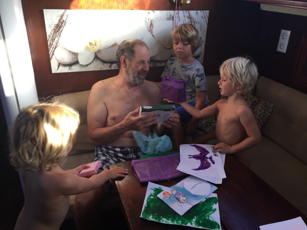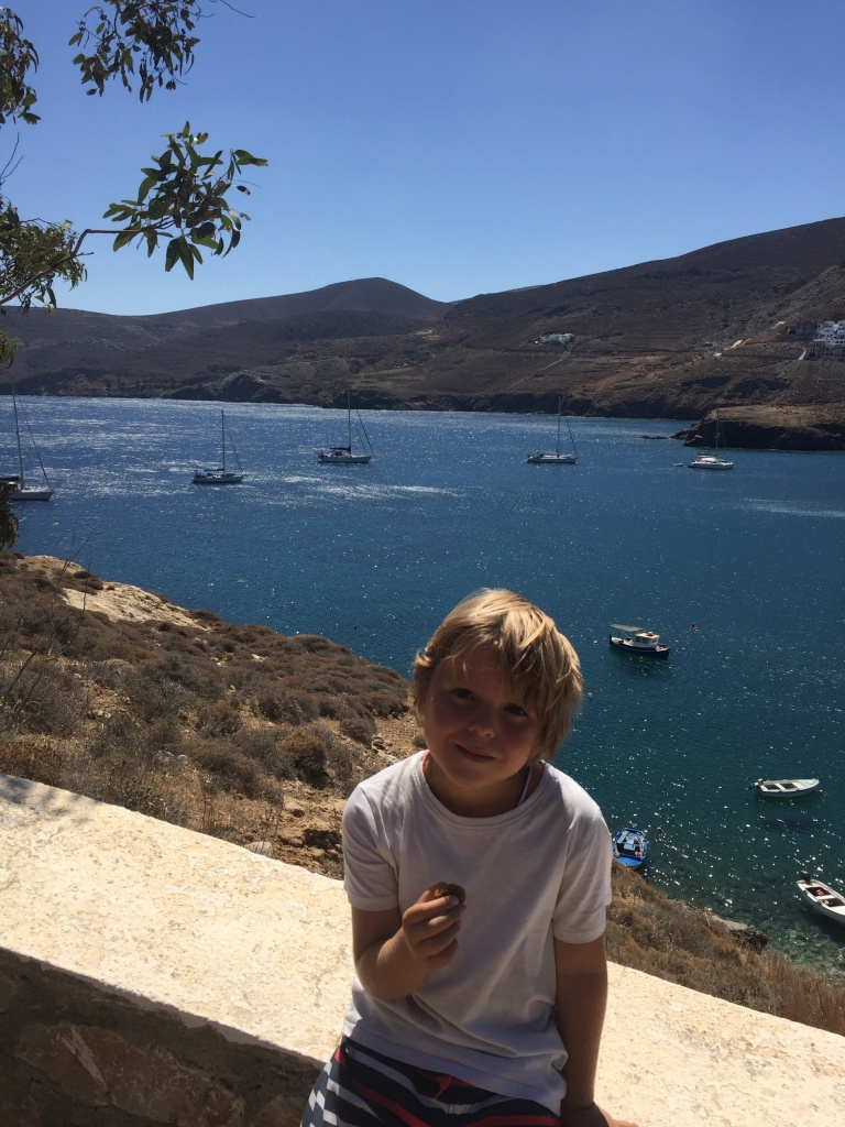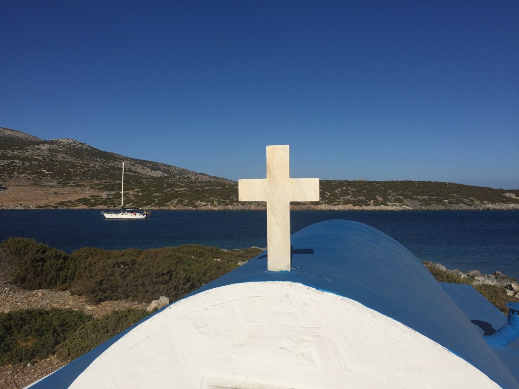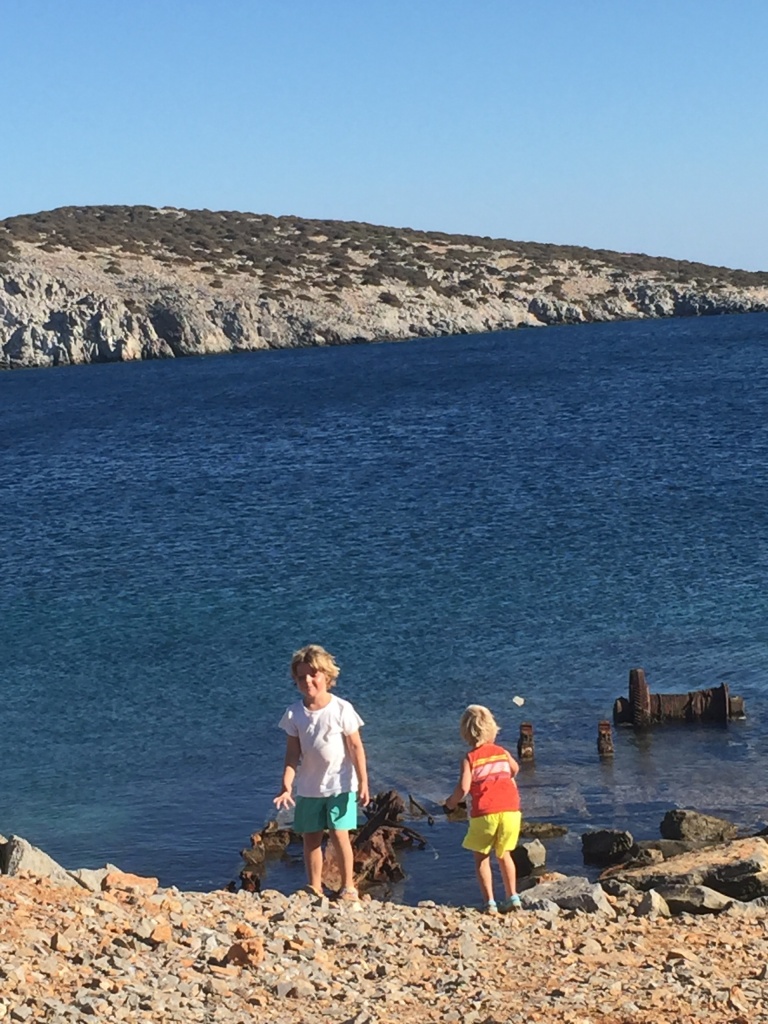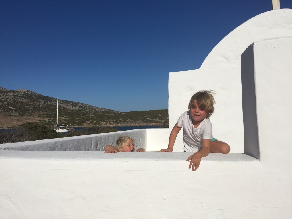 It turned out that we would be in a quiet little bay on Astipalia island. It was an interesting place, with an abandoned factory and a ruin of a boat winch, and off course a beautiful little white-and-blue church. The kids did a great job decorating granddad’s birthday cake. We ate the entire cake between the 7 of us and called it lunch…