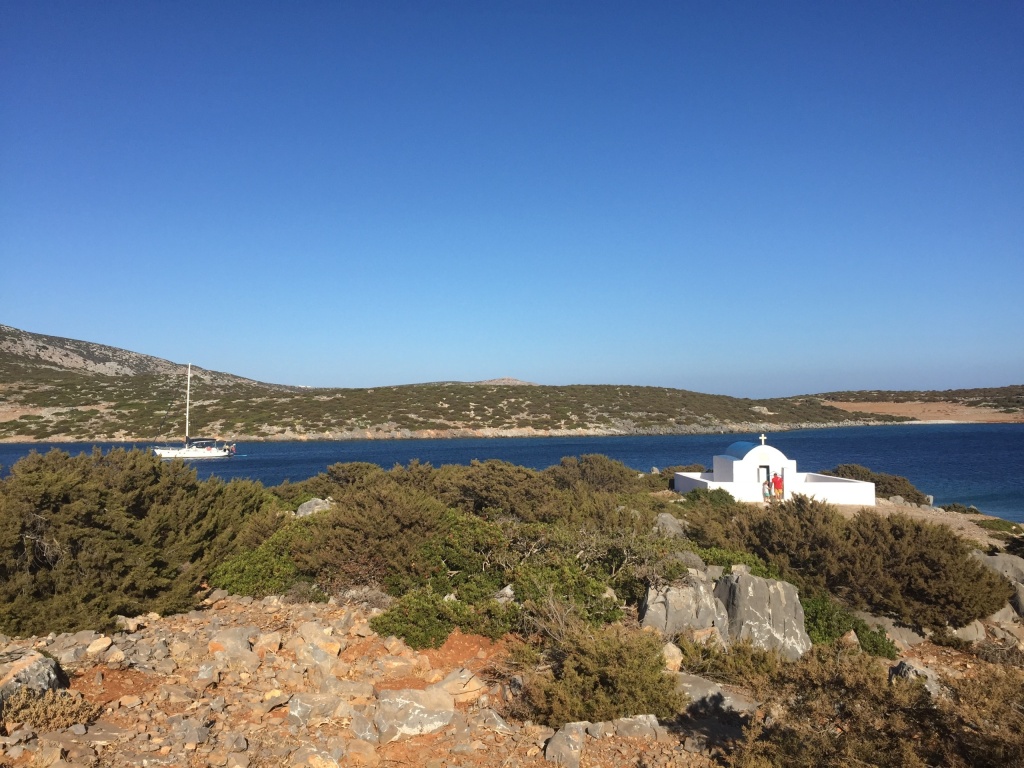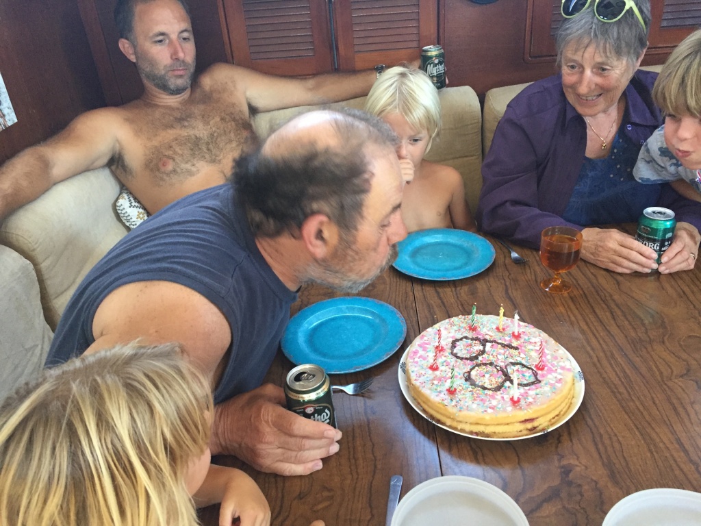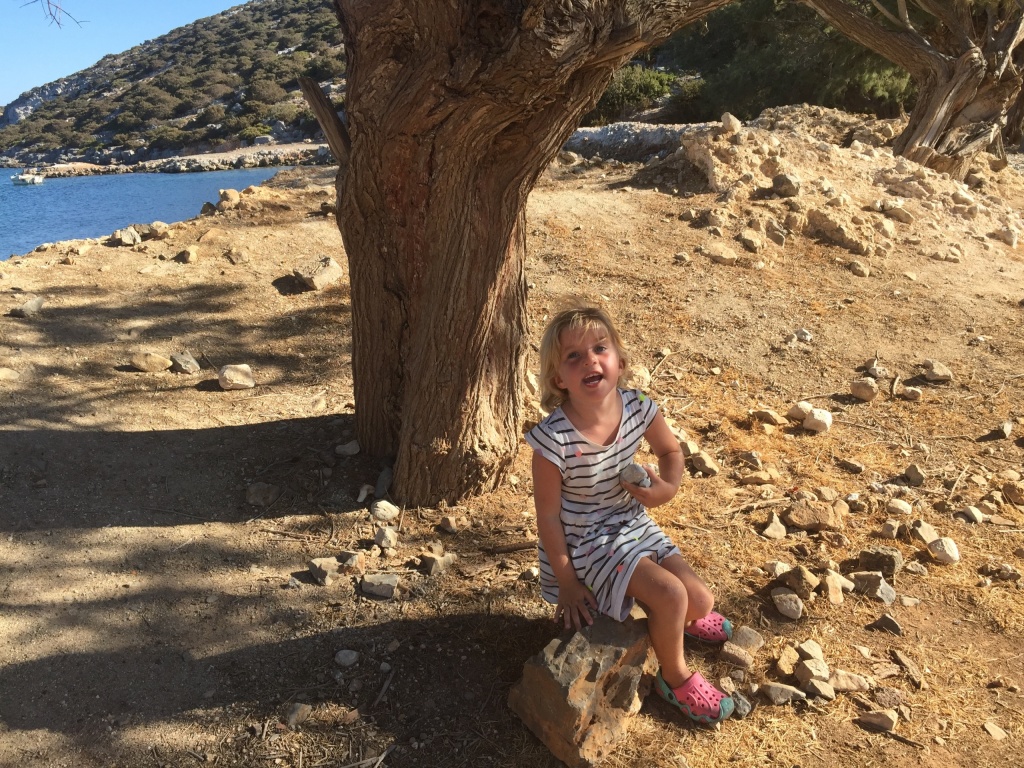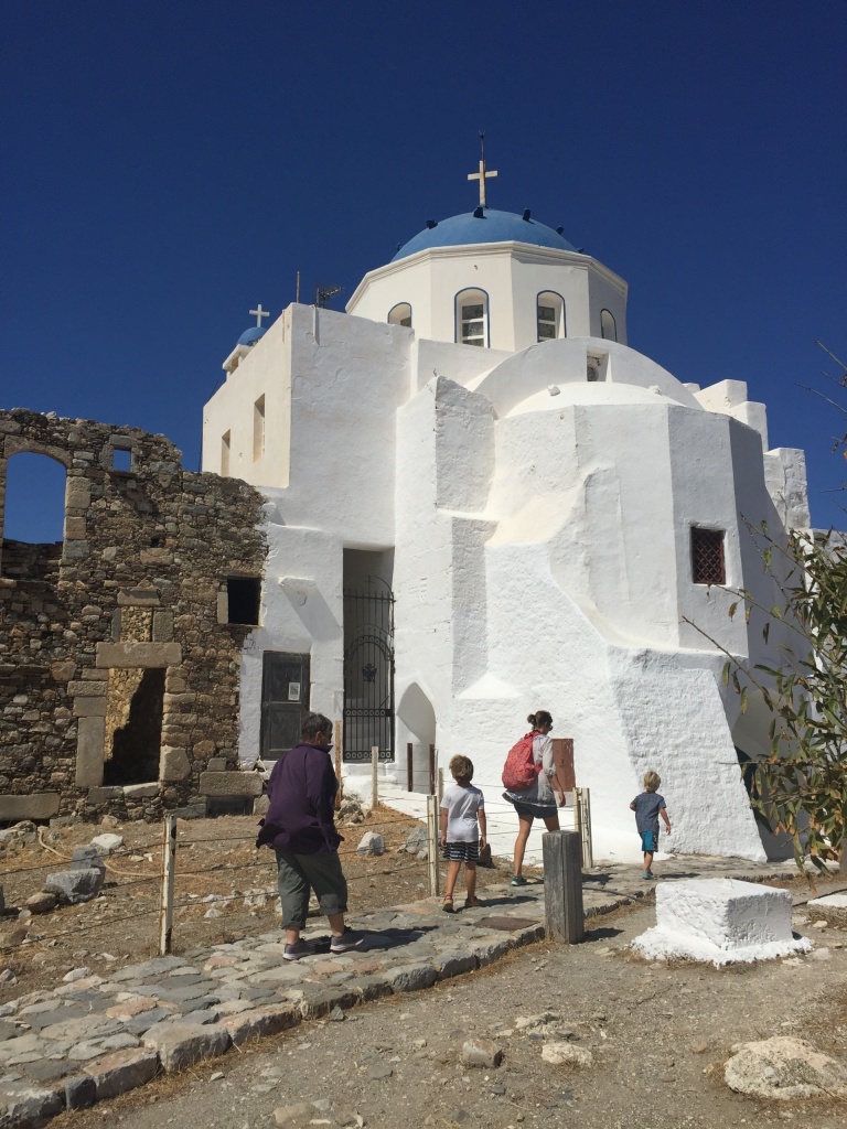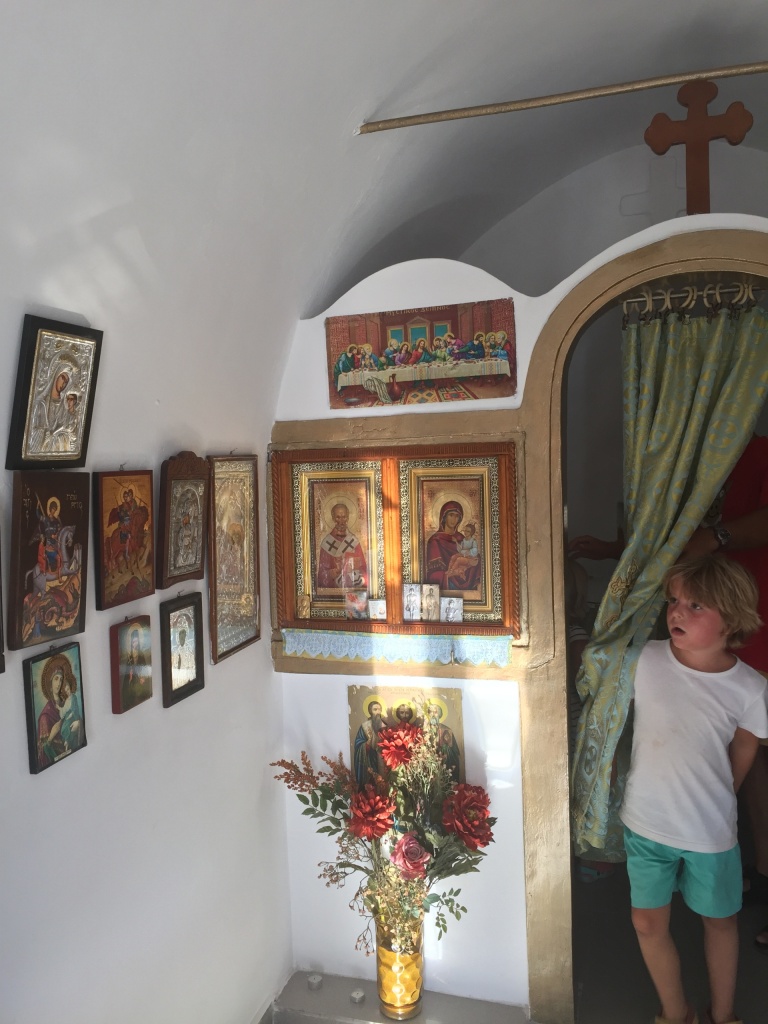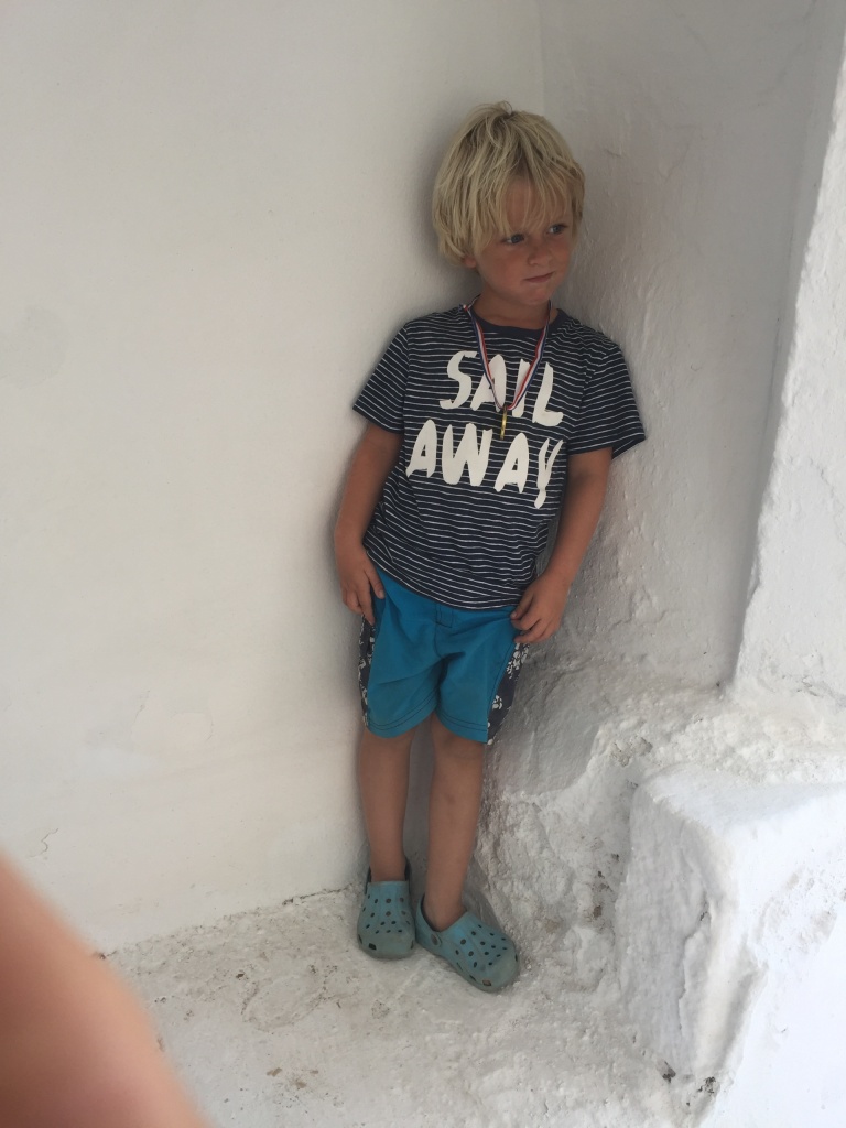 It turned out that we would be in a quiet little bay on Astipalia island. It was an interesting place, with an abandoned factory and a ruin of a boat winch, and off course a beautiful little white-and-blue church. The kids did a great job decorating granddad’s birthday cake. We ate the entire cake between the 7 of us and called it lunch…