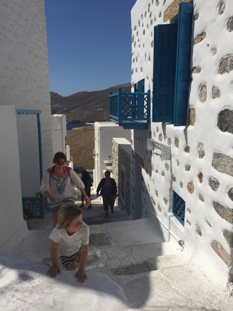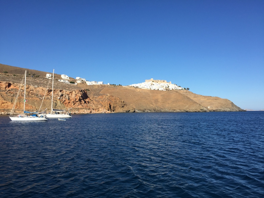 In the afternoon we sailed to the main town of Astipalia. Most islands in this area have a Skala and a Chora. The skala is the newer town, situated below by the sea. It will have a little port or an anchor bay. The chora is the old town, built on the top of a hill. It is usually part of a fortified castle, or at least surrounded by high walls and will have a castle or monastery-type structure in the middle. The entire chora is often hidden from view until you are close in, or looking from a certain angle. These old towns go back to the days when the Greek island where plagued by pirates. Having the town on a hilltop meant that the people could see them coming, and as the guidebook points out, gave them time to lock up their valuables and daughters…